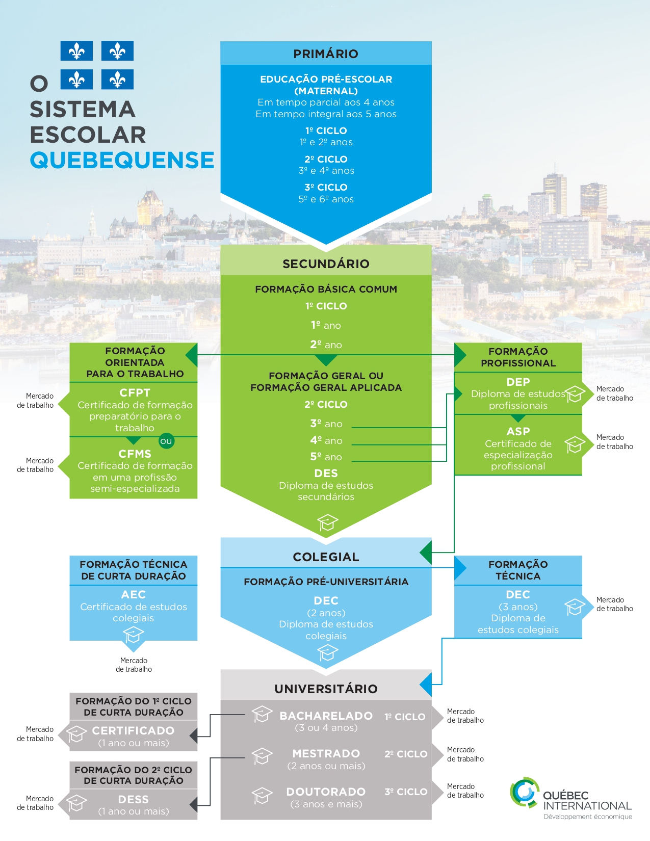 Sabemos que é difícil compreender bem um sistema escolar diferente daquele ao qual estamos geralmente habituados. Por isso, preparamos uma tabela que explica os diferentes níveis de estudos no Quebec.